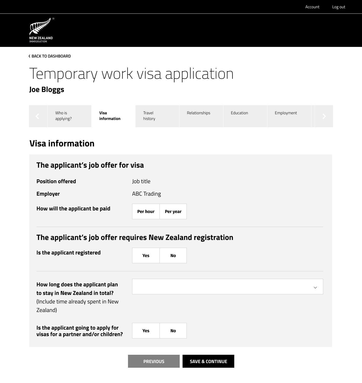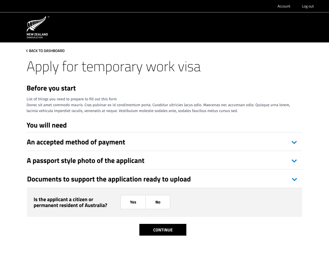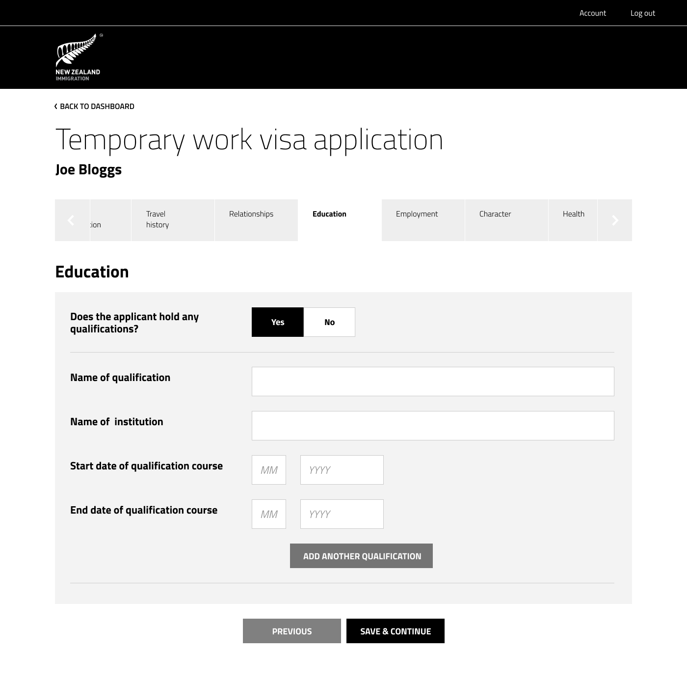 The redesigned visa applications needed to be "smart forms", so relevant questions are asked, based on the answers applicants give and the visa they’re applying for. For these I worked with subject matter experts to understand the visa rules and logic, so that the applications could be simplified where possible and streamlined.