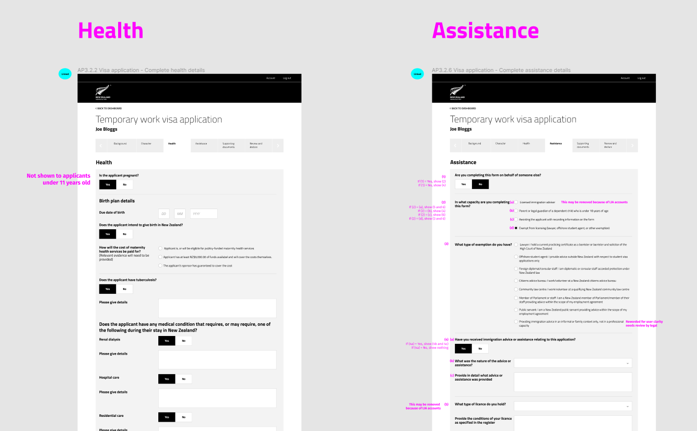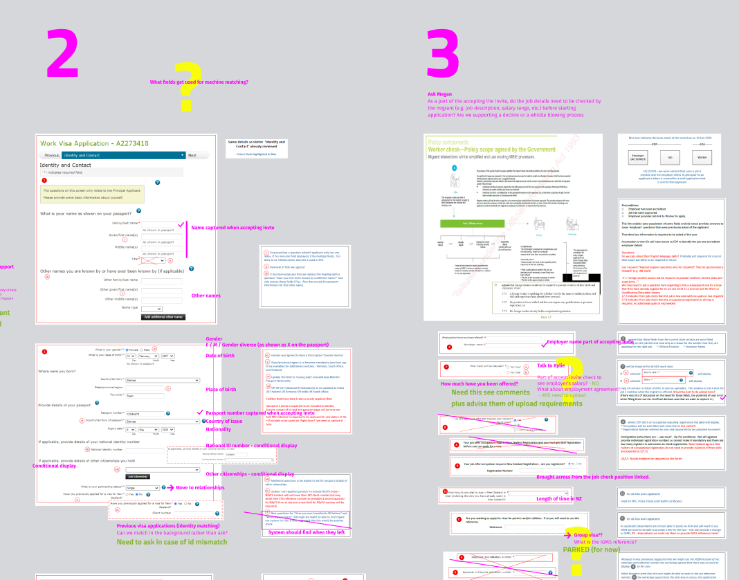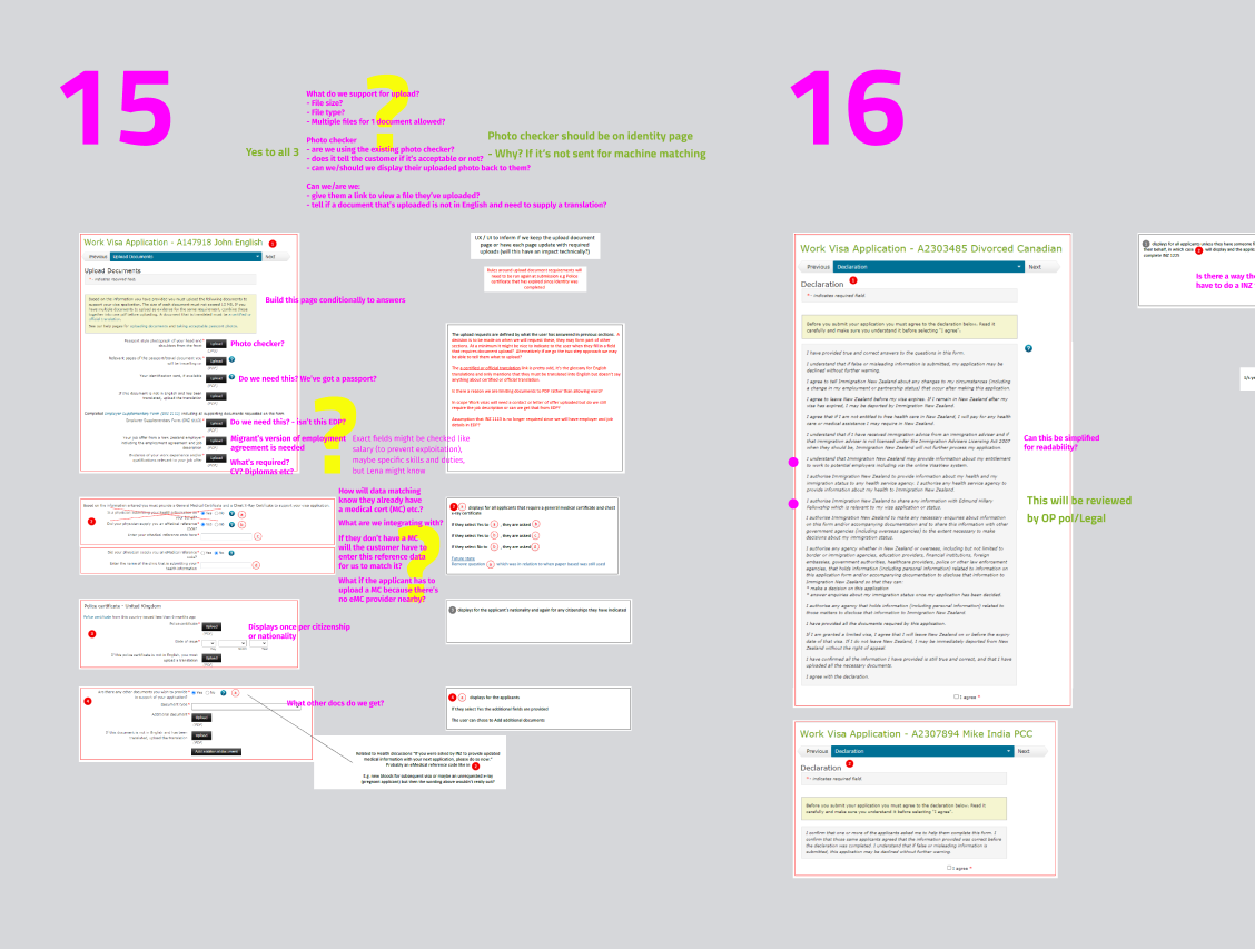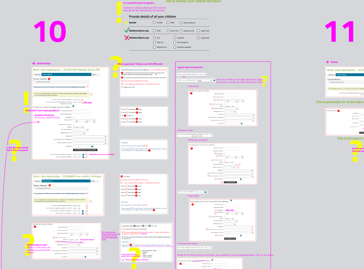 This was a fascinating process, getting to know the intricacies of immigration rules and working with experts in the field. Figma was still a fairly new tool when we started to use it for this work, the comment feature and figjam hadn't been released yet. We decided on figma because of the ease of being able to work on the same file together, and the short learning curve for basic functions. The "creative" pink and yellow notes were our way of "making it work".