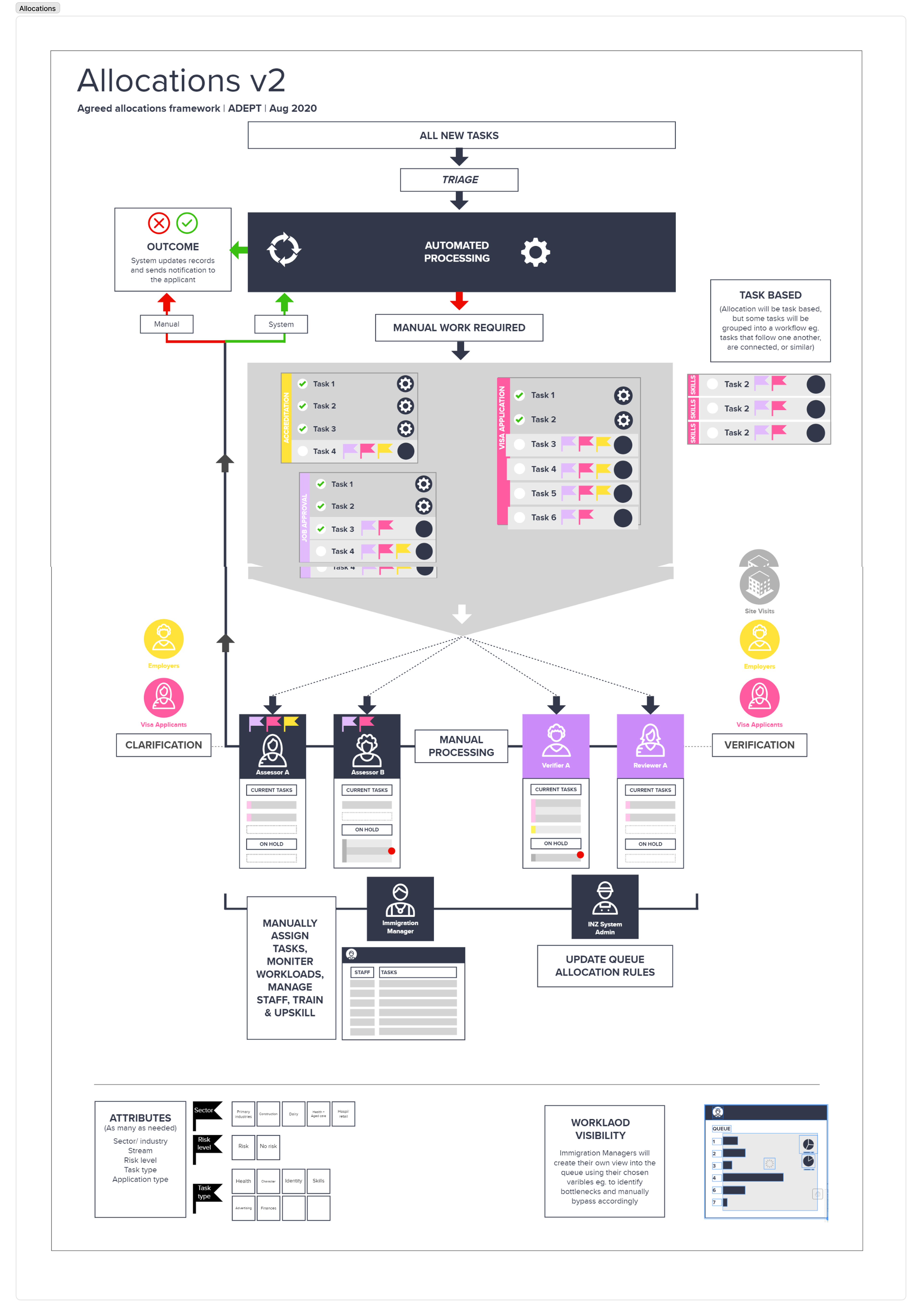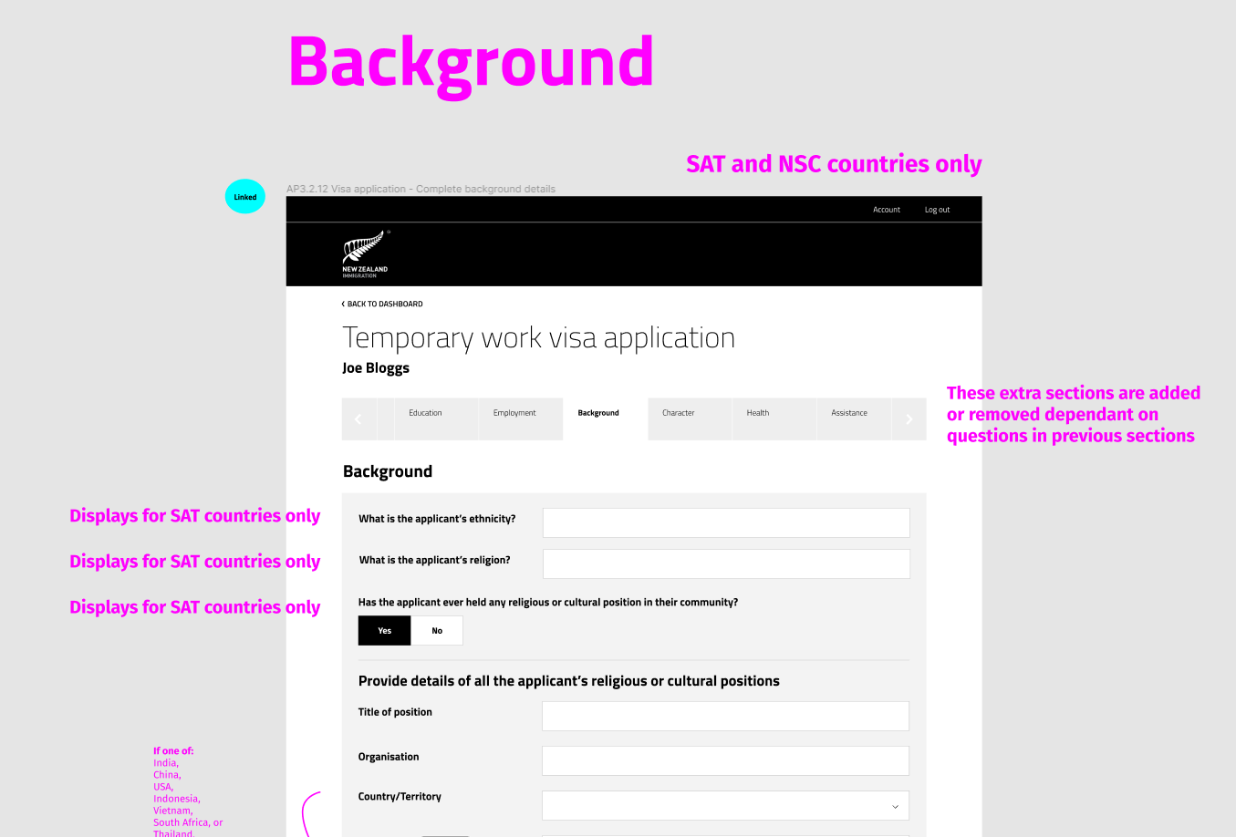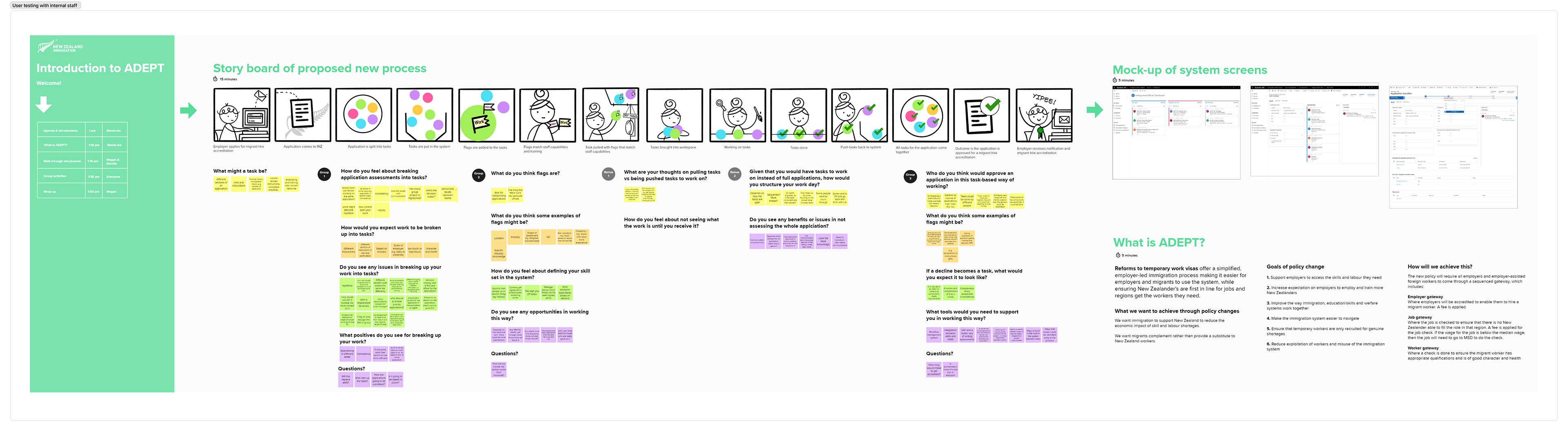 This was a fascinating process, getting to know the intricacies of immigration rules and working with experts in the field. Figma was still a fairly new tool when we started to use it for this work, the comment feature and figjam hadn't been released yet. We decided on figma because of the ease of being able to work on the same file together, and the short learning curve for basic functions. The "creative" pink and yellow notes were our way of "making it work".